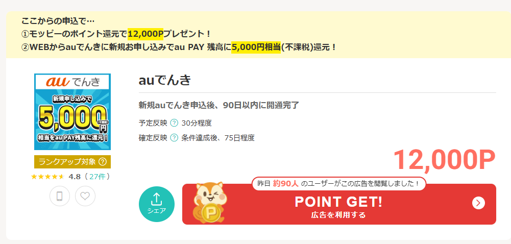 - 「auでんき」を検索して「POINT GET!」をクリック