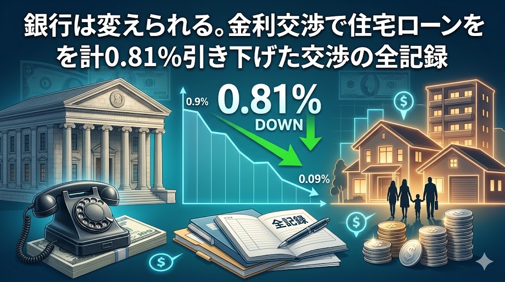 金利を0.81%下げると、残債2,000万円・残り20年なら返済総額が約160万円変わります。私は電話一本の交渉でこれを実現しました。この記事では、同じことをあなたが再現できるよう、交渉の全手順を公開します。目次